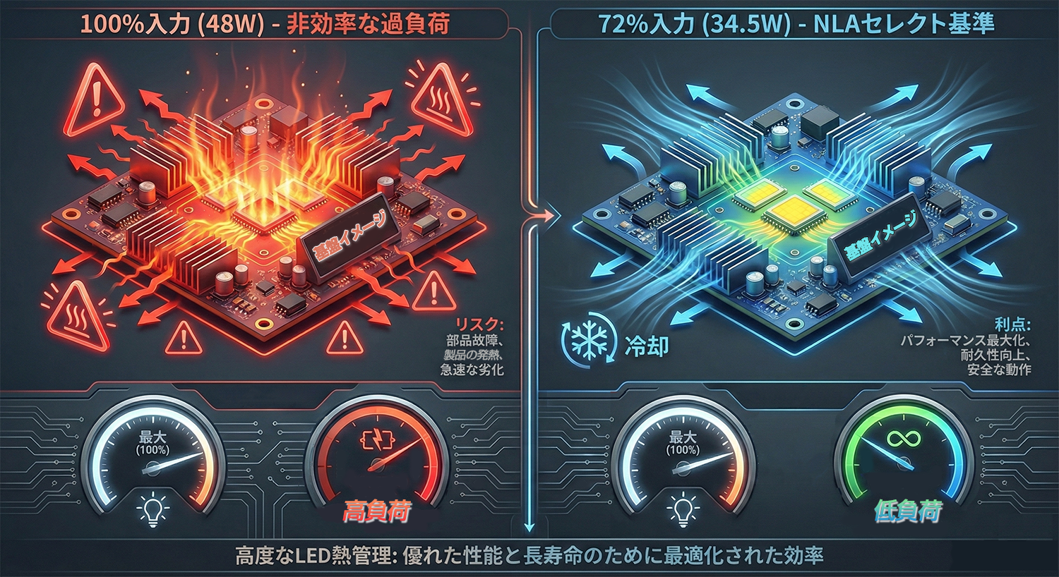 NLAセレクトが48W作業灯において、実効消費電力を約34.5W(理論値の約72%)に設定しているのには、明確な技術的エビデンスがあります。